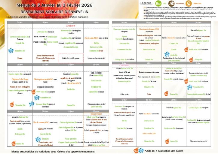Retrouvez ici les menus de cantine de la période du 5 janvier au 13 février 2026